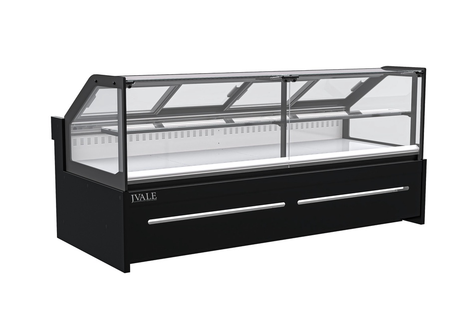 ثلاجة عرض أفقية من جيفال بواجهة زجاجية مستقيمة وتبريد هوائي متوازن مع مساحة سفلية للتخزين وإضاءة LED لتجهيزات السوبرماركت.