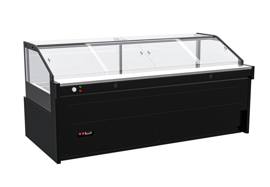 ثلاجة عرض أفقية من جيفال بتصميم زجاجي مائل ومؤشرات تحكم أمامية مع نظام تبريد فعّال لعرض اللحوم والجبن ضمن تجهيزات السوبر ماركت