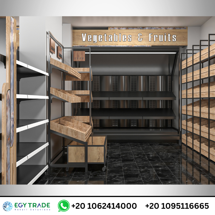 ظهر في الصور قسم خضار وفاكهة بتجهيز خشبي بالكامل مع لمسات معدنية سوداء: