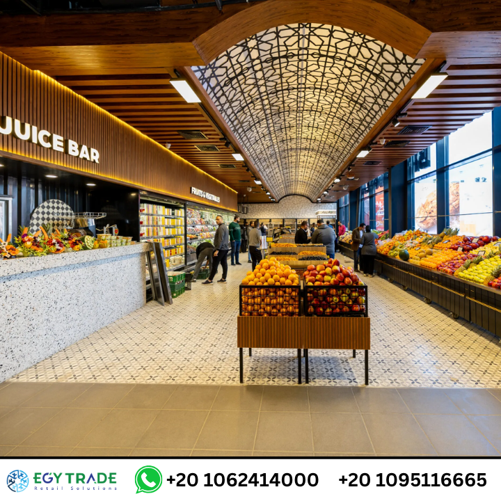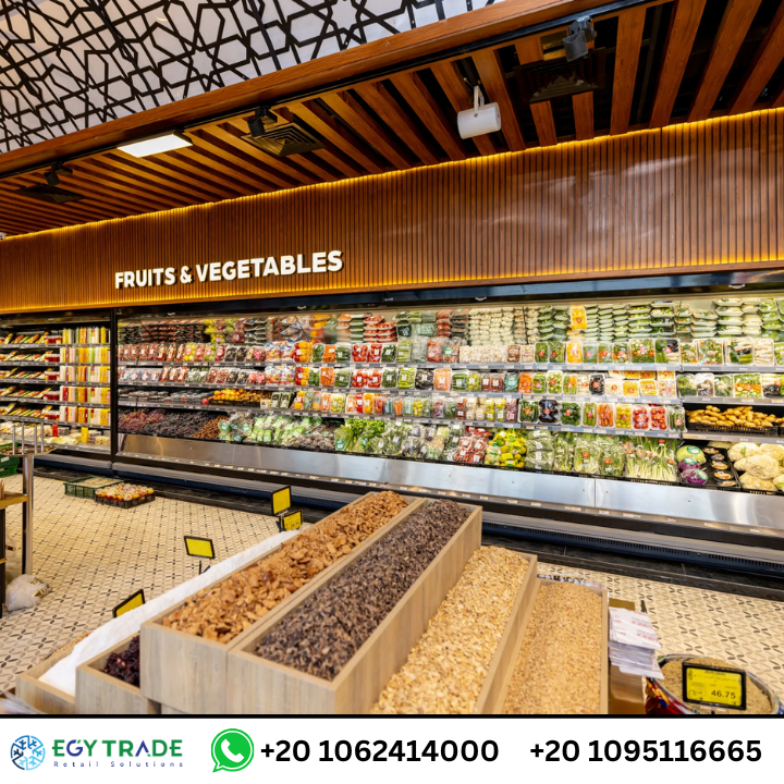 - واجهات عرض خشبية متناسقة مع قسم الخضار والفاكهة.