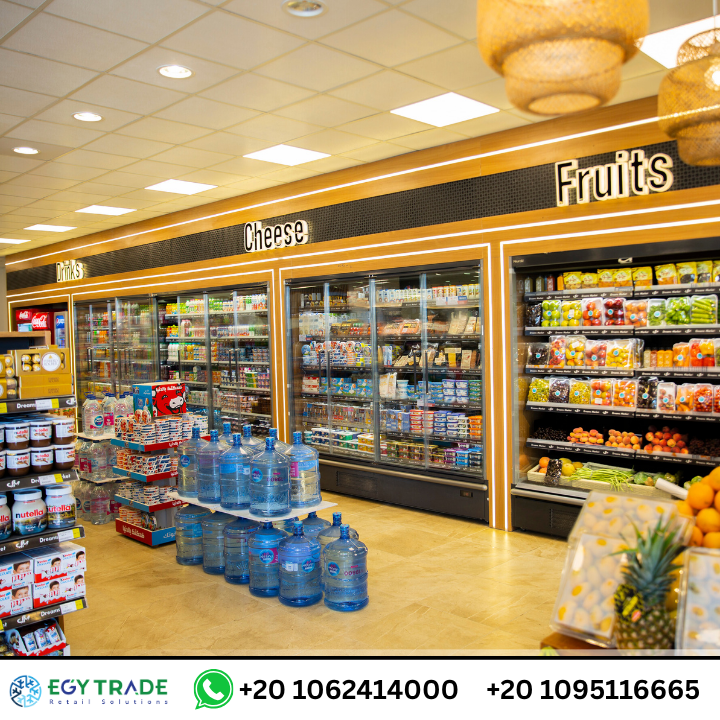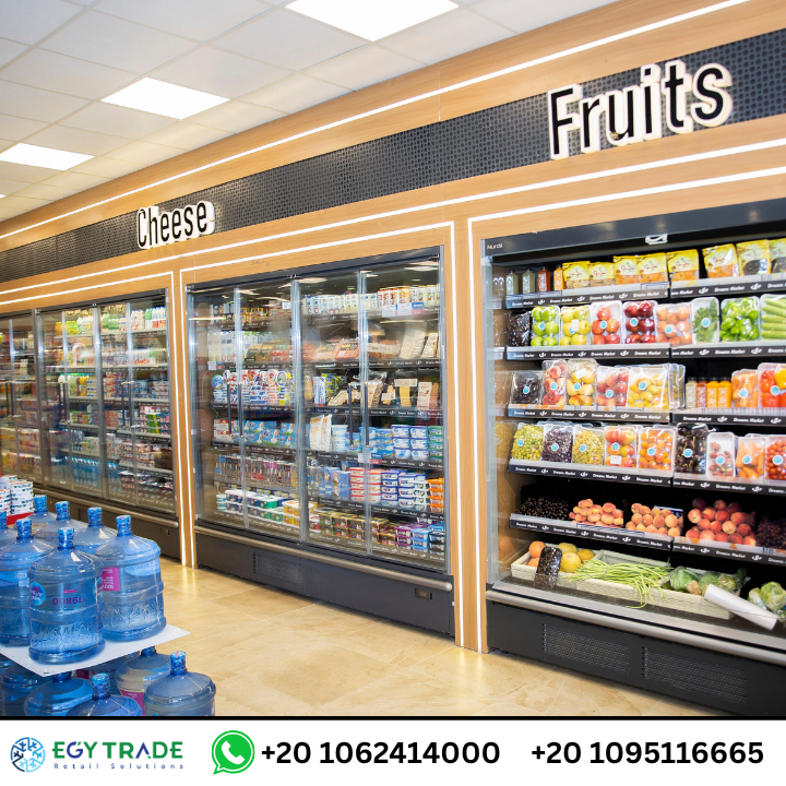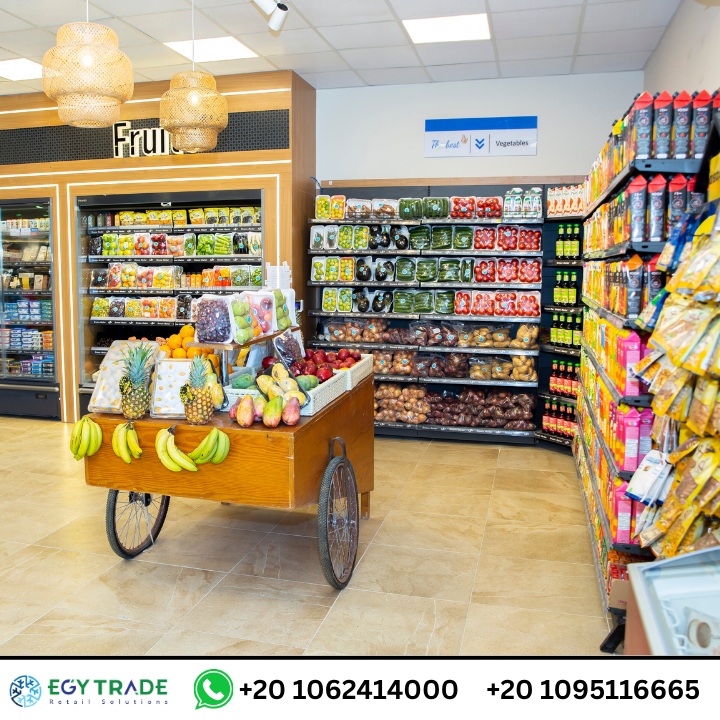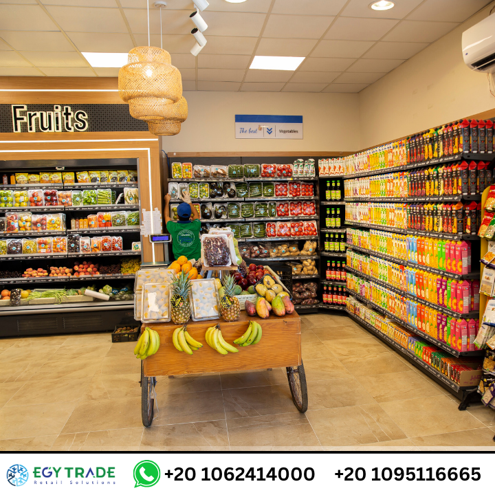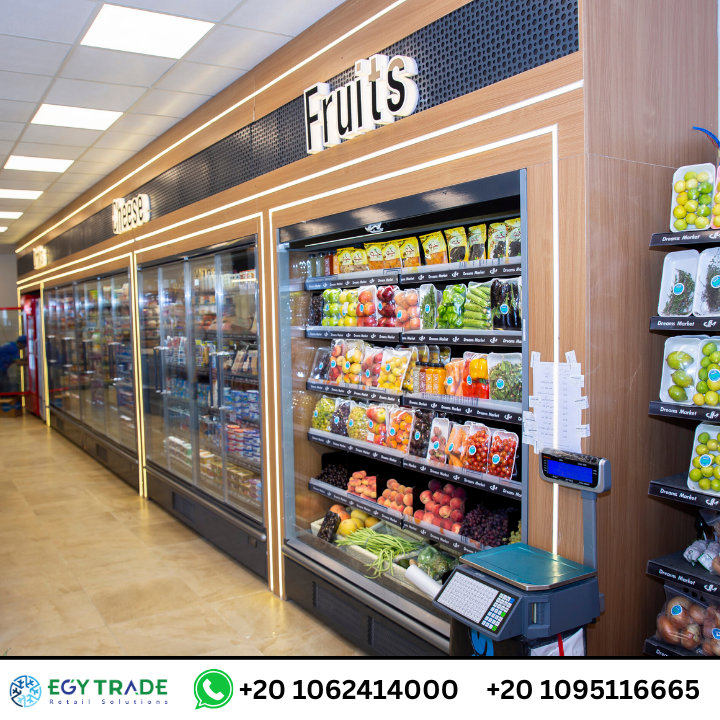 تجهيزات سوبر ماركت احترافية تشمل ثلاجات عرض سوبر ماركت، رفوف معدنية حديثة، ووحدات خضار وفاكهة متطورة لمشروع Dream Market — جاهز للتسليم.