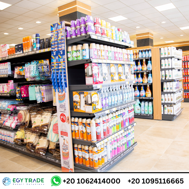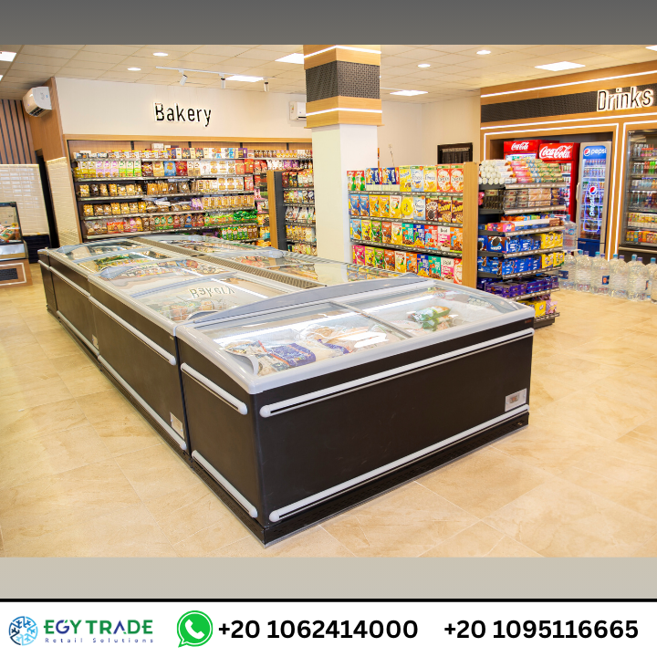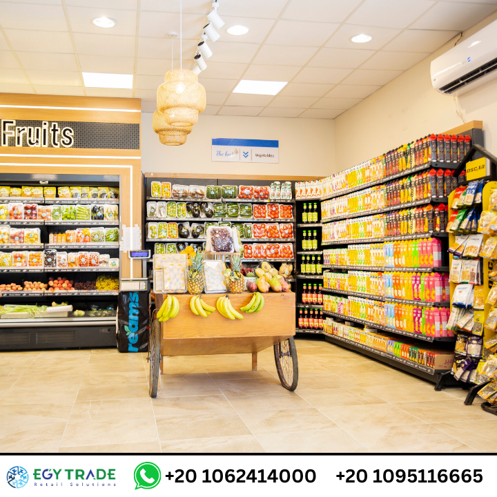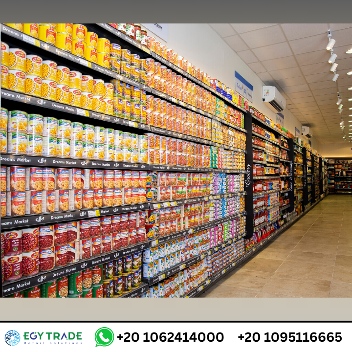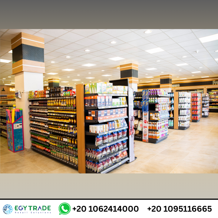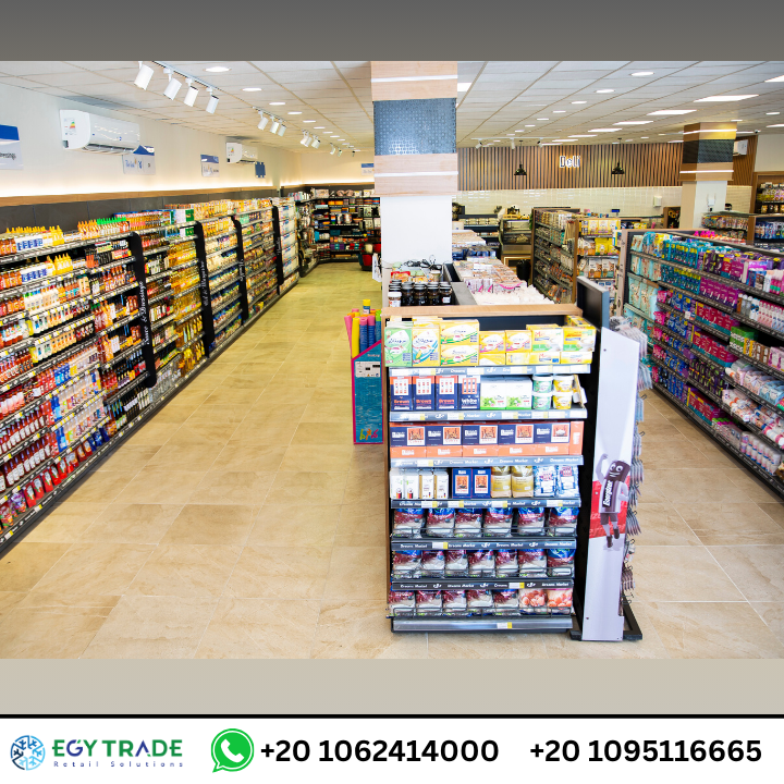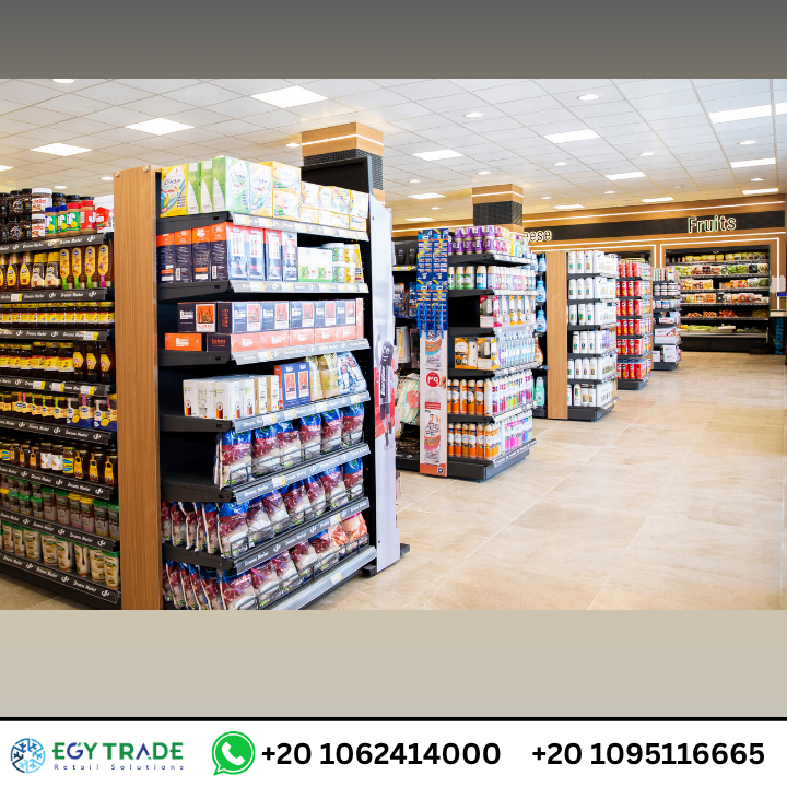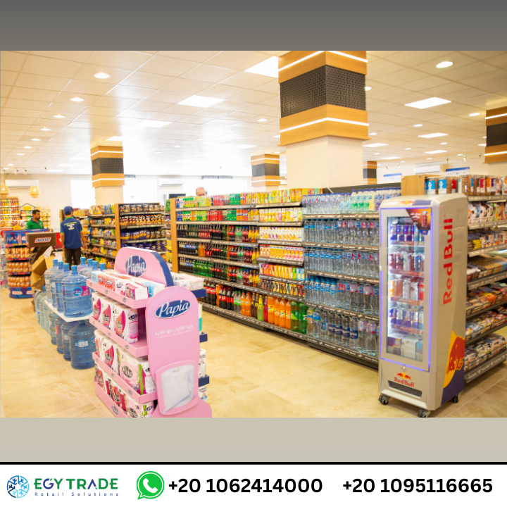 تجهيزات سوبر ماركت احترافية تشمل ثلاجات عرض سوبر ماركت، رفوف معدنية عالية الجودة، وجندولات عرض منظمة لمشروع Dream Market — جاهز للتسليم.