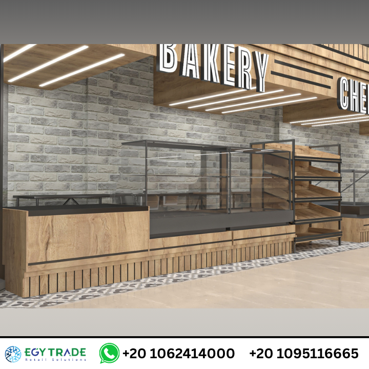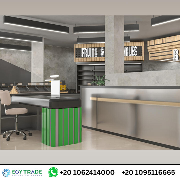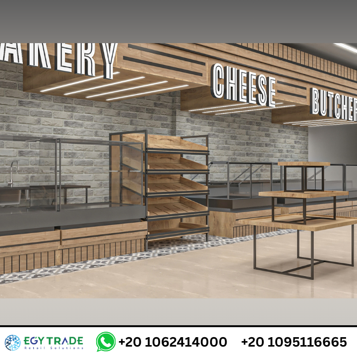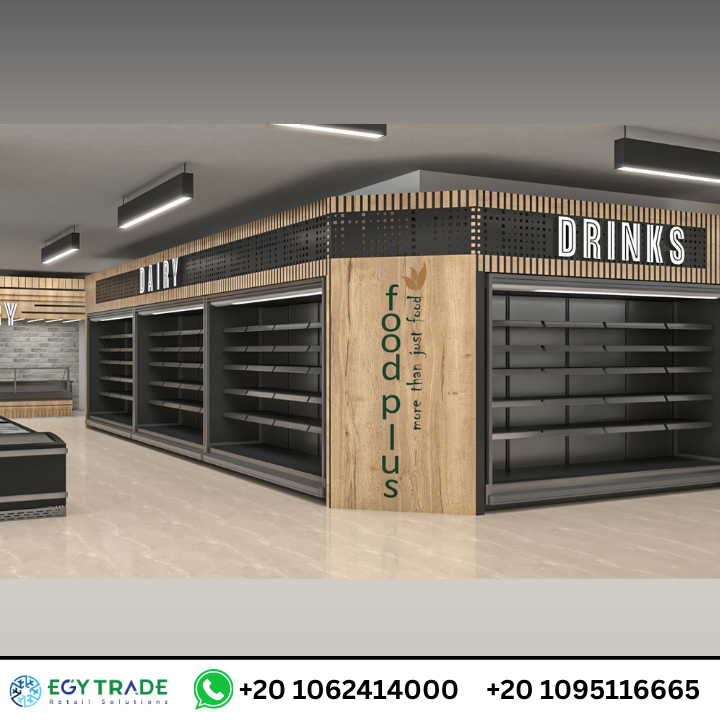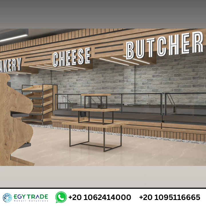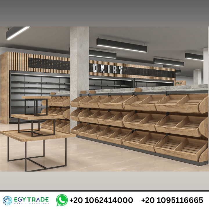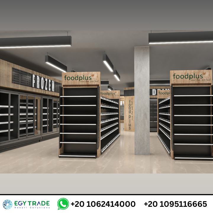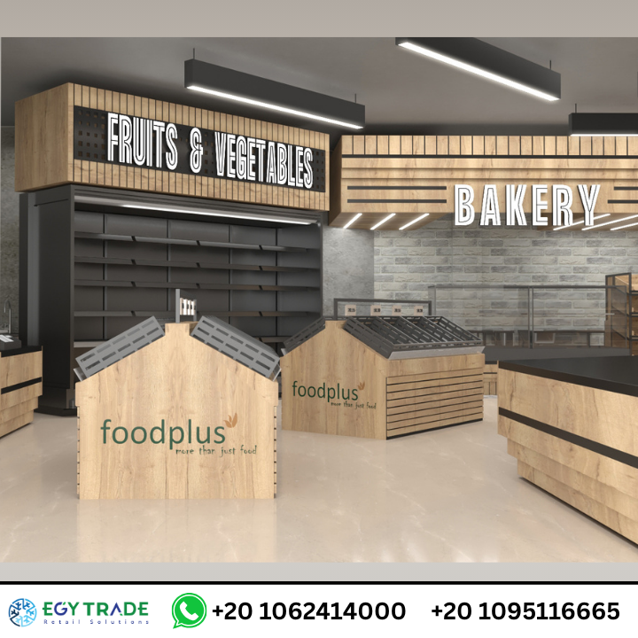 مشروع FoodPlus يتميز بتصميم داخلي حديث يعتمد على الخشب والخرسانة، وتجهيزات شاملة تشمل ثلاجات عرض للأجبان والمجمدات، أرفف بقالة، وحدات خضار وفاكهة،