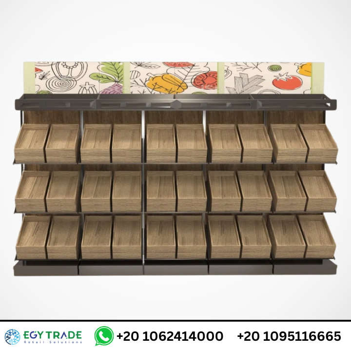 لرفع مبيعات قسم الفاكهة والخضار، يُفضل استخدام رفوف متعددة الصناديق مثل هذا النموذج، لأنها تقلل الفوضى وتسمح بفرز المنتجات حسب النوع واللون، مما يحفّز العملاء على الشراء ويزيد معدل الدوران داخل المساحات المزدحمة.