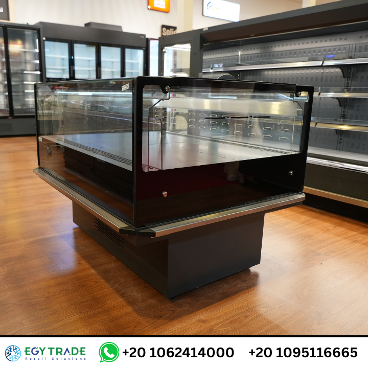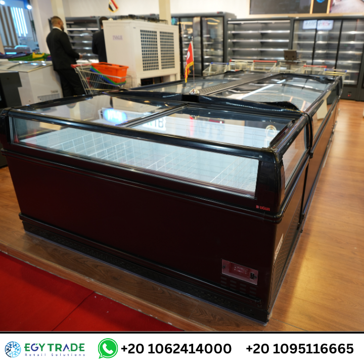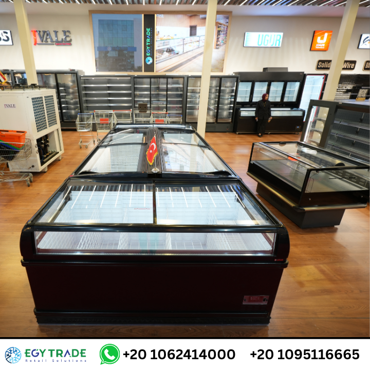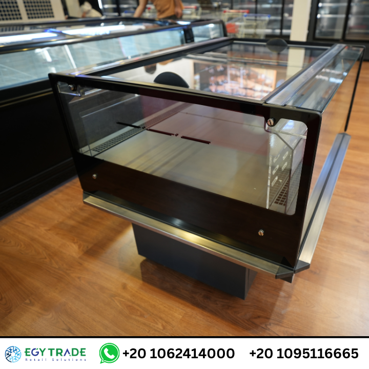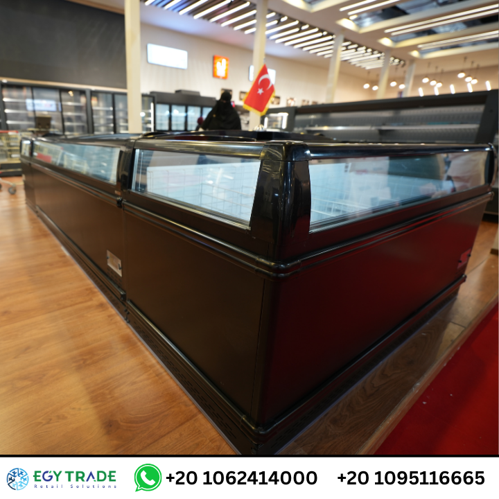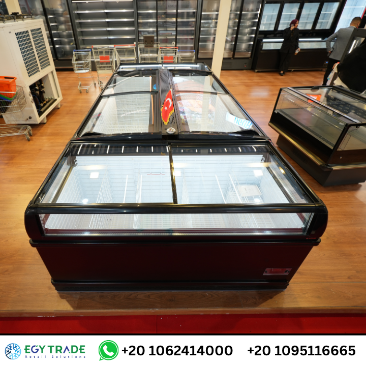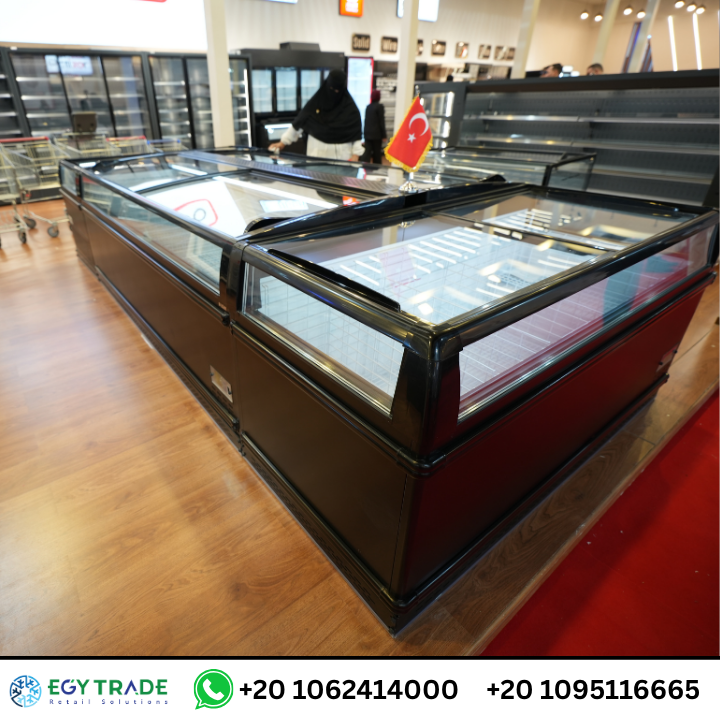 الصور توضح وجود ثلاجات آيلاند (Island Freezers) بغطاء زجاجي منزلق، تتميز بـ: