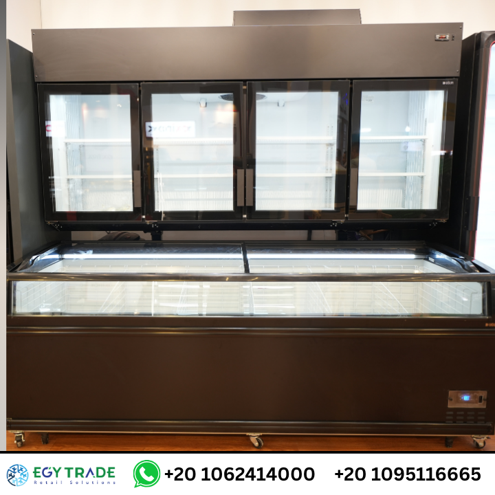 مستخدمة لعرض اللحوم المبردة، بواجهة زجاجية بانورامية وتصميم هندسي يحافظ على درجة الحرارة حتى مع فتح الغطاء.