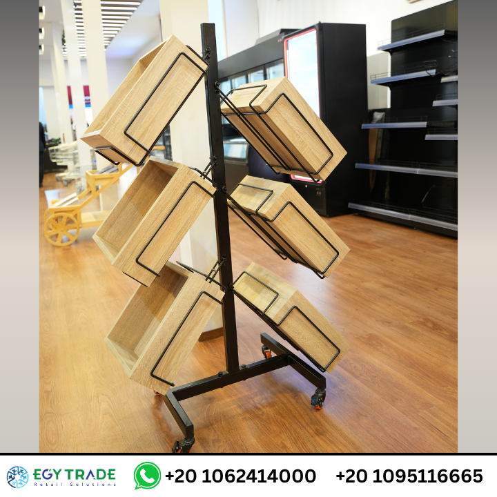 تظهر الصور اعتماد وحدات عرض مائلة من خشب معالج مثبت على هيكل معدني أسود، مصممة لرفع مستوى وضوح المنتجات.