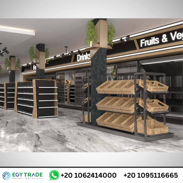 - وحدات عرض مستقلة للفاكهة والخضار بتشطيب خشبي كامل.