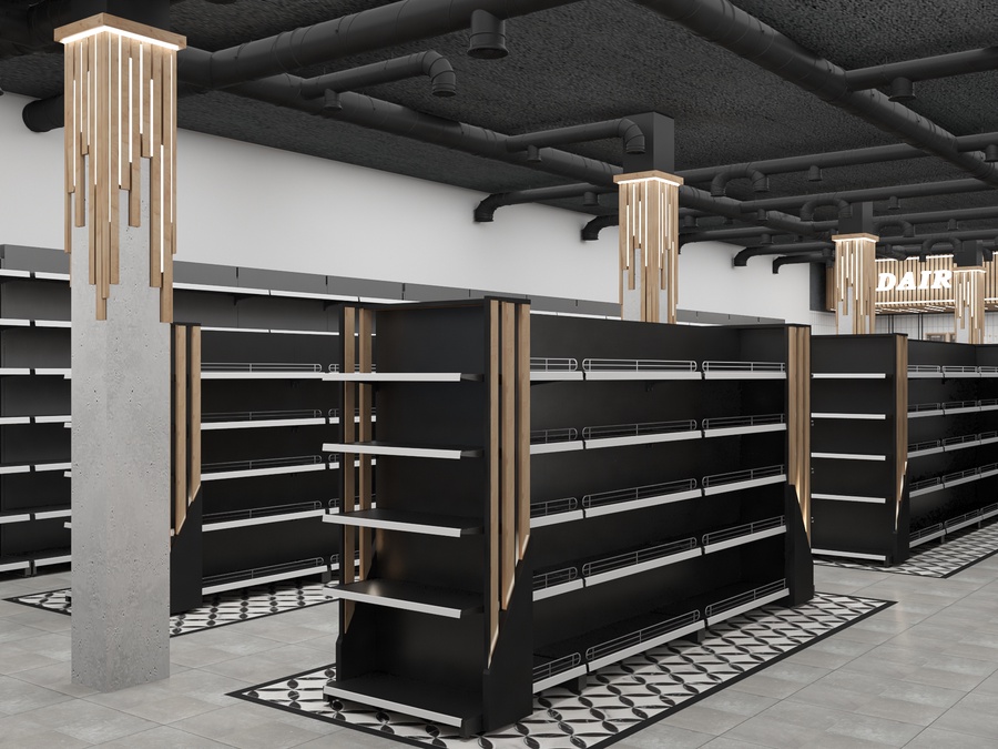 هذا التصميم مناسب للممرات الرئيسية داخل السوبر ماركت ويجمع بين الوظيفة العملية والمظهر المنظم