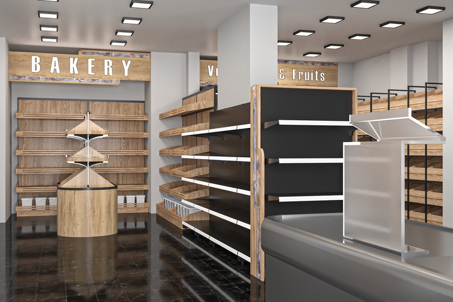 يتيح التصميم توزيعًا منظمًا للمساحات لتوفير رؤية واضحة لكل صنف مع إمكانية الدمج بين الأرفف الجانبية والوحدات المركزية