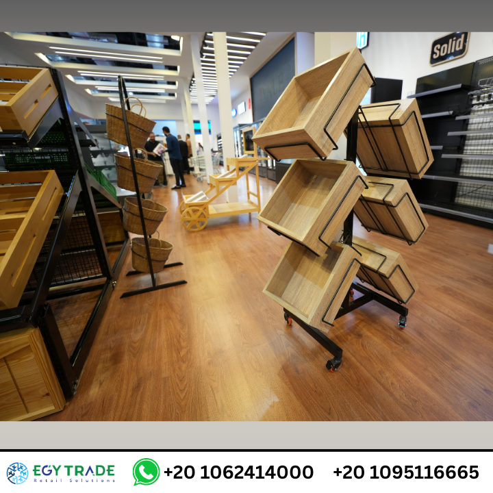 ستاند العرض الدوّار المزود بصناديق خشبية يمثل أحد أفضل حلول عرض المنتجات الخفيفة داخل مشاريع السوبر ماركت، حيث يوفر رؤية واضحة وسهولة الوصول للمنتجات.