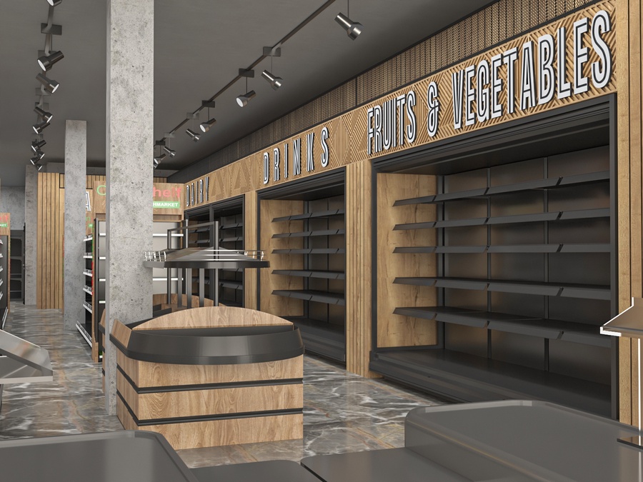 يُبرز التصميم واجهات عرض بانورامية للأقسام الثلاثة (الفواكه والخضروات، المشروبات، الألبان) مع إضاءة موجهة لزيادة وضوح المنتجات وتسهيل تجربة التسوق للعملاء