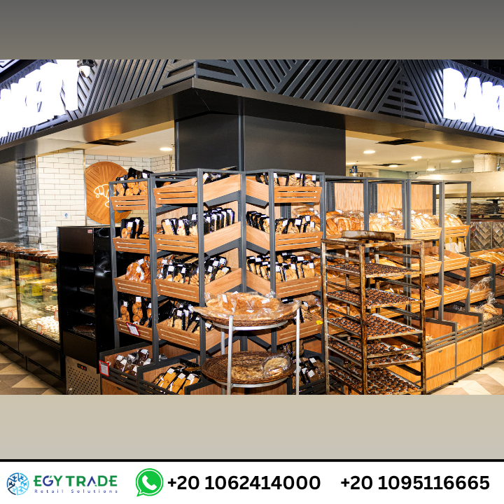 تم استخدام جندولات معدنية وسطية عالية التحمل لتنظيم فئات المنتجات بكفاءة، في حين يضم قسم المخبوزات وحدات عرض خشبية ومعدنية متعددة المستويات توفر تهوية مثالية للمخبوزات الطازجة. أما قسم الديلي والجزارة فيعتمد على واجهات عرض زجاجية مبردة تحافظ على الجودة وتلائم معايير الغذاء التجارية
