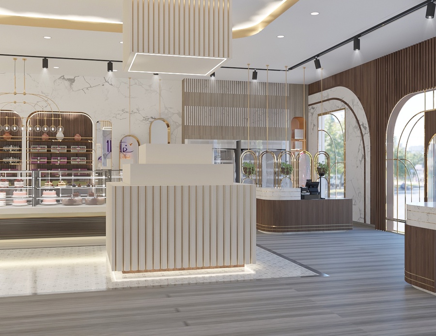 يضم التصميم ثلاجات عرض زجاجية للحلويات والكيك، ووحدات عرض مركزية مضاءة توفر تنظيمًا مثاليًا للمساحة الداخلية