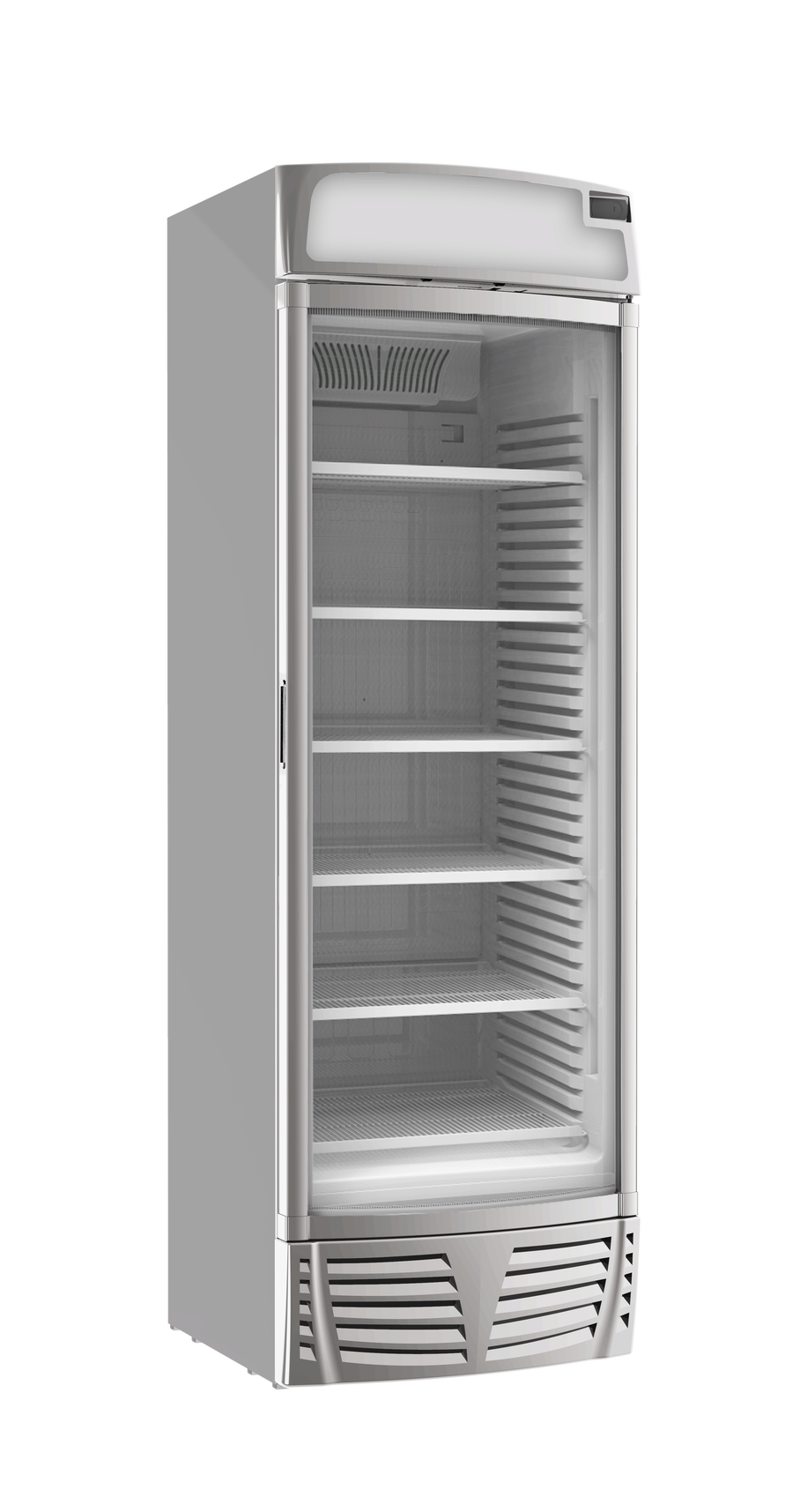 تأتي الثلاجة بتصميم رأسي مزود بباب زجاجي شفاف يتيح رؤية المنتجات بسهولة ويمنح المتجر مظهراً احترافياً عصرياً