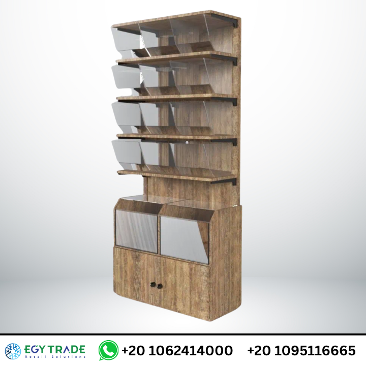 هذه الوحدة الخشبية المزودة بصناديق أكريليك شفافة تعتبر من أكثر حلول العرض فاعلية داخل السوبر ماركت ومحلات البقالة.
