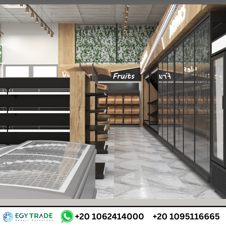 هذا الدمج يحقق توازنًا مثاليًا بين العملية والجمال، ويُستخدم ضمن أنظمة شركة تجهيز سوبر ماركت متكاملة، ويخدم مخططات الهايبر ماركت وعمليات تصميم سوبر ماركت كامل، لتوفير حركة سلسة وعرض واضح للمنتجات.