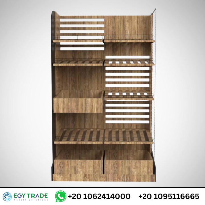 هذه الوحدة الخشبية ذات الرفوف المعدنية تُعد من أبرز الحلول التي تعتمد عليها أي شركة بيع تجهيزات سوبر ماركت عند تجهيز أقسام البقالة والعطارة والمنتجات الجافة.