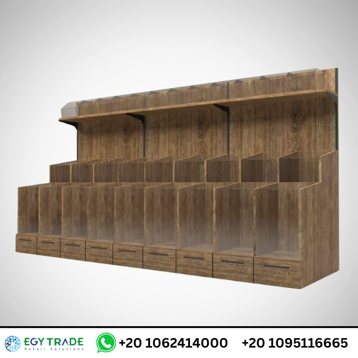 هذه الوحدة الخشبية العميقة والمتعددة الأقسام تُعد من أهم حلول العرض التي تحتاجها أي عملية تجهيز بقالة ميني ماركت، حيث توفر تنظيمًا واضحًا وكبيرًا للبقوليات والمنتجات السائبة.