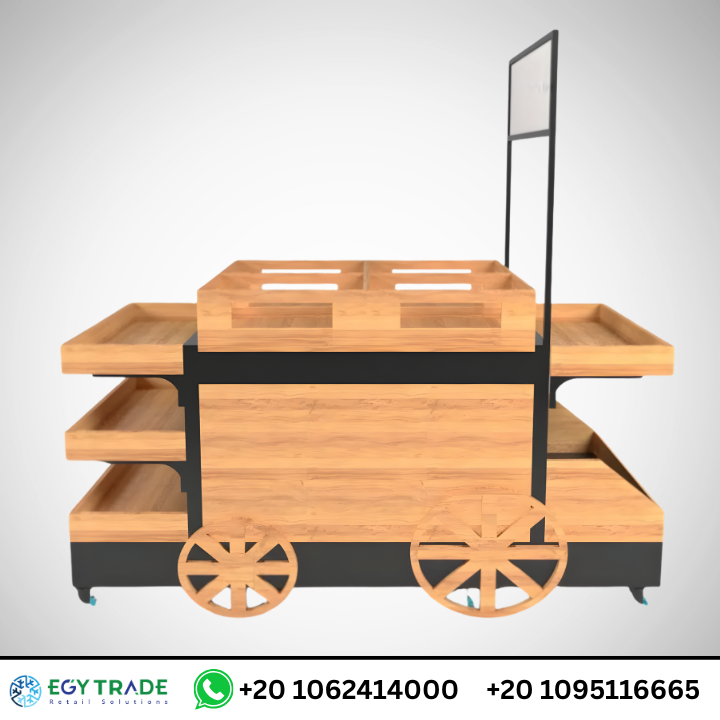 هذه العربة الخشبية المصممة خصيصًا لعرض الخضار والفاكهة توفر طريقة منظمة وجذابة لعرض المنتجات الطازجة داخل المتاجر. تعتبر إضافة عملية لمشروعات التجهيزات التي تنفذها شركة بيع تجهيزات سوبر ماركت وتُعد حلًا مناسبًا للمحال التي تتعاون مع مزود معدات المحلات التجارية.