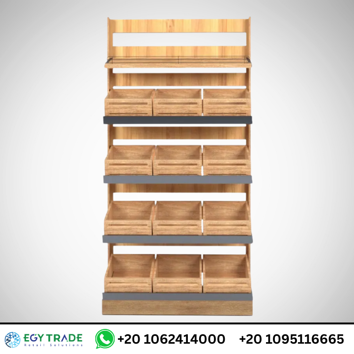 هذا الستاند الخشبي المصمم خصيصًا لعرض الخضار، الفاكهة أو المنتجات السريعة، يُعد من أقوى حلول تجهيزات افتتاح سوبر ماركت الحديثة.